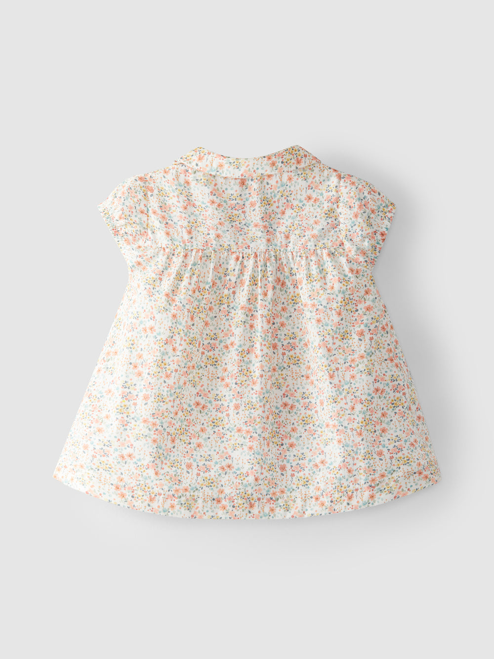 襟は丸襟、胸部にはコーラルカラーの細いリボン。Laranjinhaの木製ボタンが前面にあしらわれており、クラシカルで上品な印象の一着です。